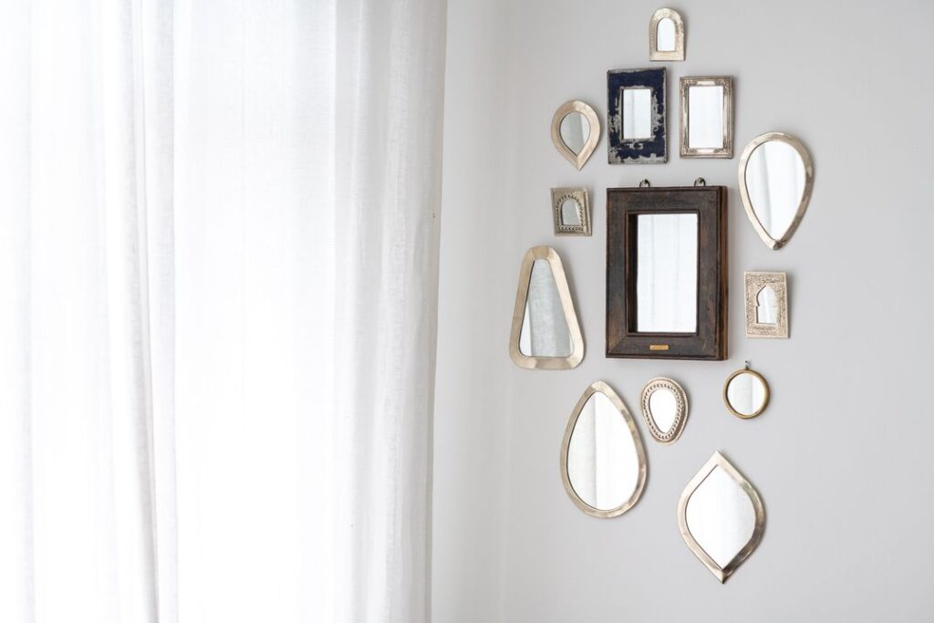 Mirrors of varying sizes can reflect incoming light around a room. Large windows can actually mimic windows themselves when placed directly across from a point of incoming sunlight, doubling the brightness of a space. If a large mirror isn’t feasible, hang multiple mirrors on one wall. Mirrors both increase the amount of natural light in the room and act as fun decor elements that can reflect your personal style.